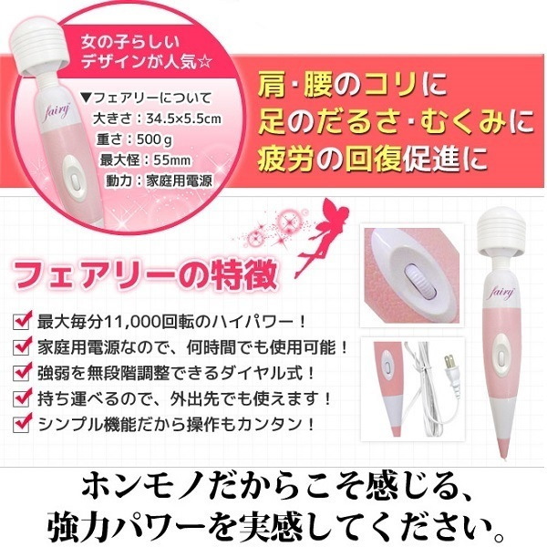 フェアリーは電動マッサージャーです。電動マッサージャーって色々な商品がありますがこれも人気の一つです。ホットエンターテイメントで人気の新作でバーチャル痴女2という作品がありますがその作品の中でも使われている電動マッサージャーがかなりバージョンアップして販売されたのがこのフェアリーです。